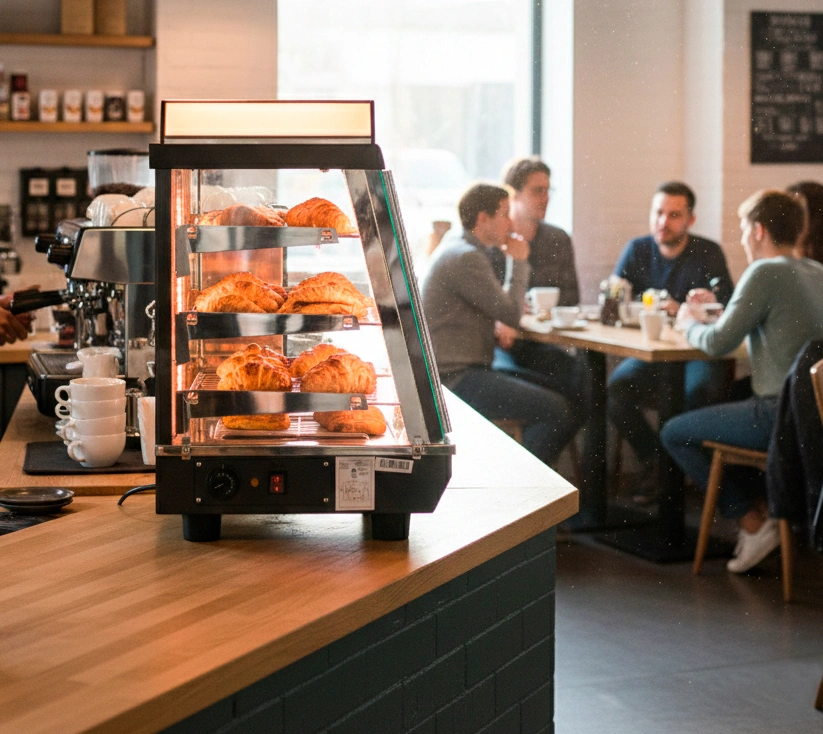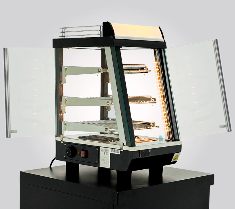 Diseñada para mantener tus productos calientes, frescos ylistos para servir. Cuenta con doble puerta de acceso —frontal para autoservicio y posterior para surtir—, sistema de vaporización controlada que conserva la humedad y crocancia de los alimentos, iluminación LED interior y control digital de temperatura. Ideal para panadería, cafetería y autoservicio