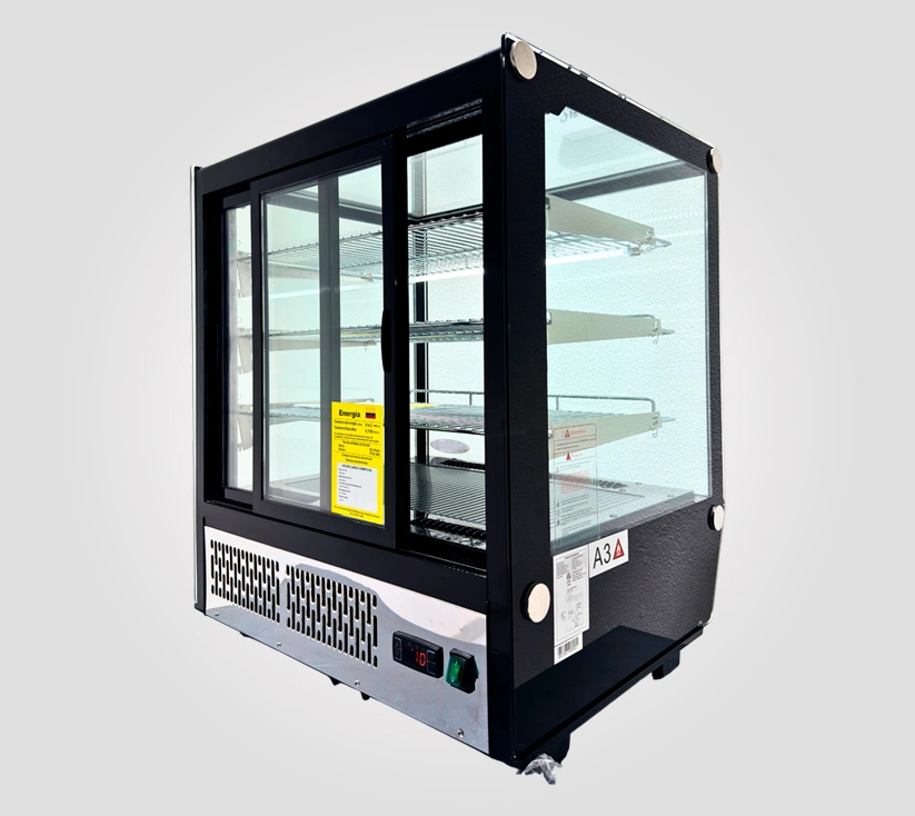 • La Vitrina Pastelera Tres Niveles ofrece amplia capacidad de exhibición gracias a sus tres entrepaños, permitiendo organizar tortas, cupcakes y repostería de forma atractiva y ordenada. Su sistema de refrigeración mantiene temperatura uniforme, conservando textura, sabor y presentación.