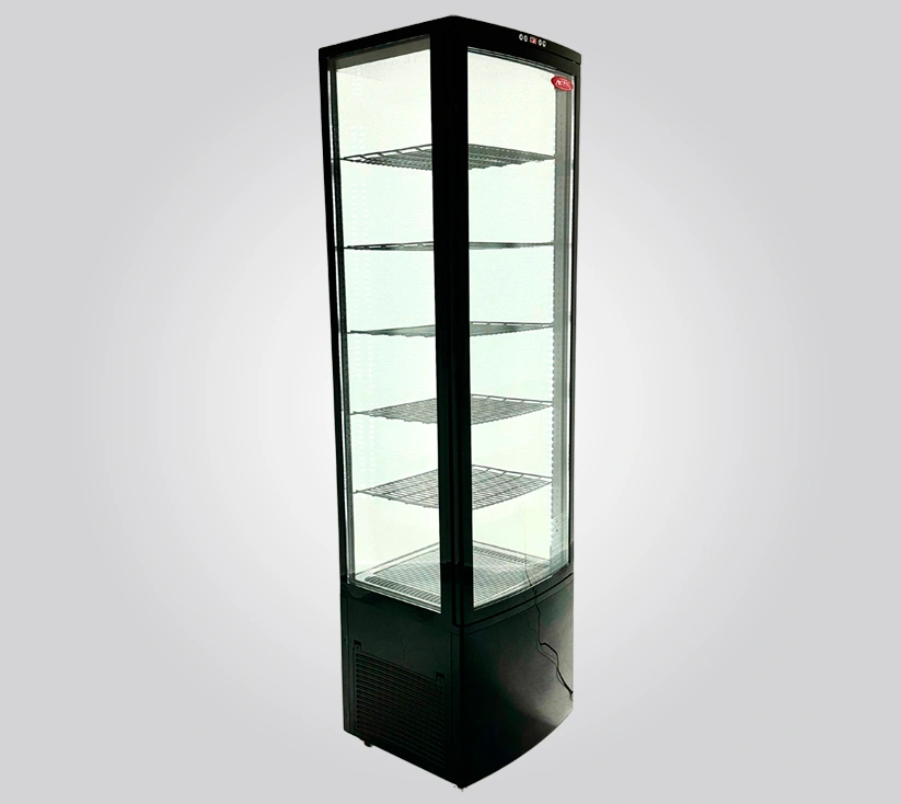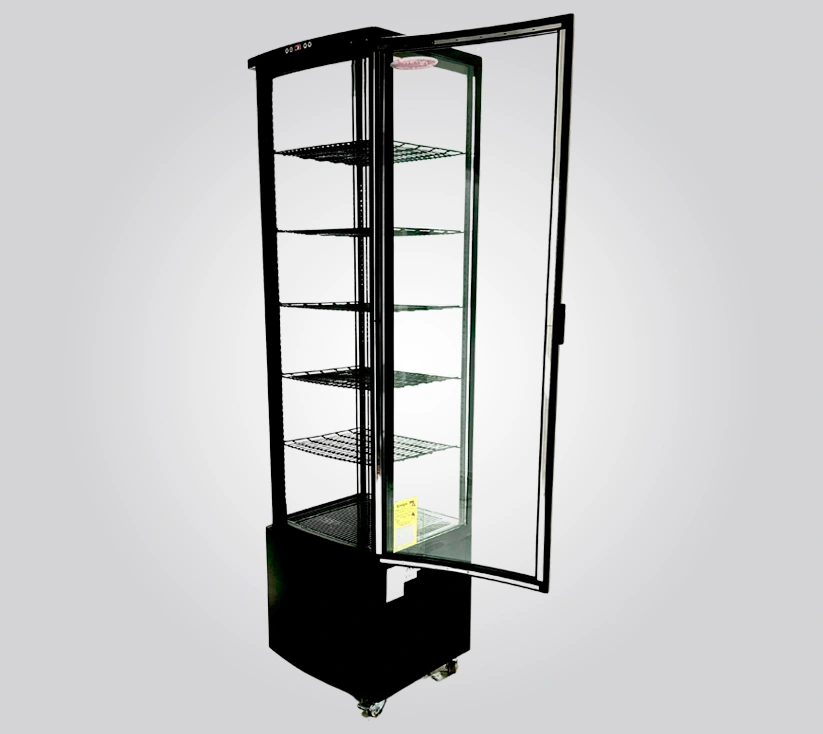 Elegancia, capacidad y espacio en un solo diseño. Su forma vertical optimiza el espacio de exhibición y ofrece una visual panoramica limpia y dividida por niveles logrando asi una exhibicion de varios tipos de postres.